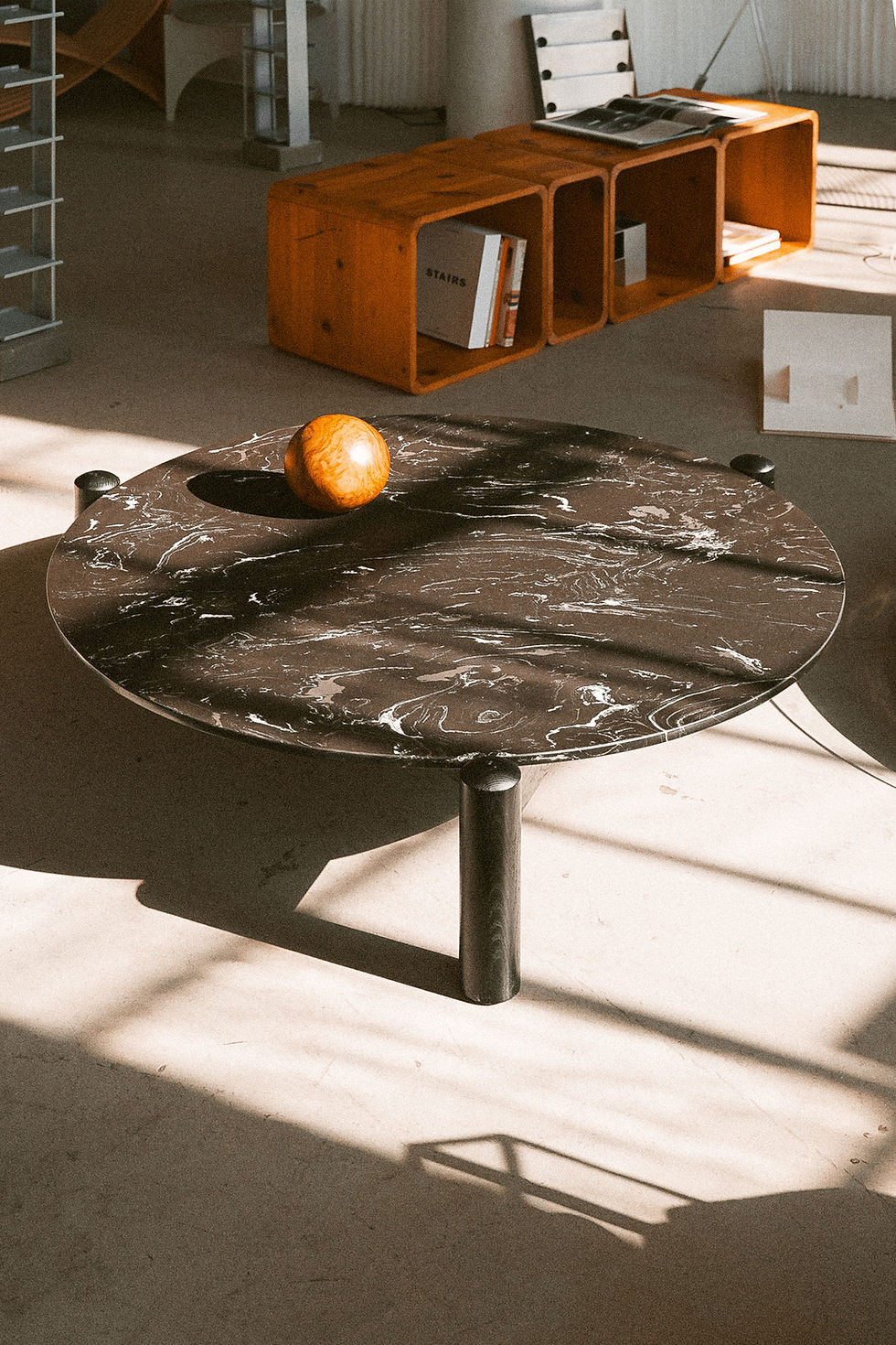 This donut shaped coffee table is a hand-turned and designed, originally commissioned for a private project. Crafted from 16-gauge cold-rolled steel shaped over a wooden form. Left unfinished as raw steel, the piece shows it's history and will continue to patina over time. Glass top allows for the form of the base to take precedent over the table itself.